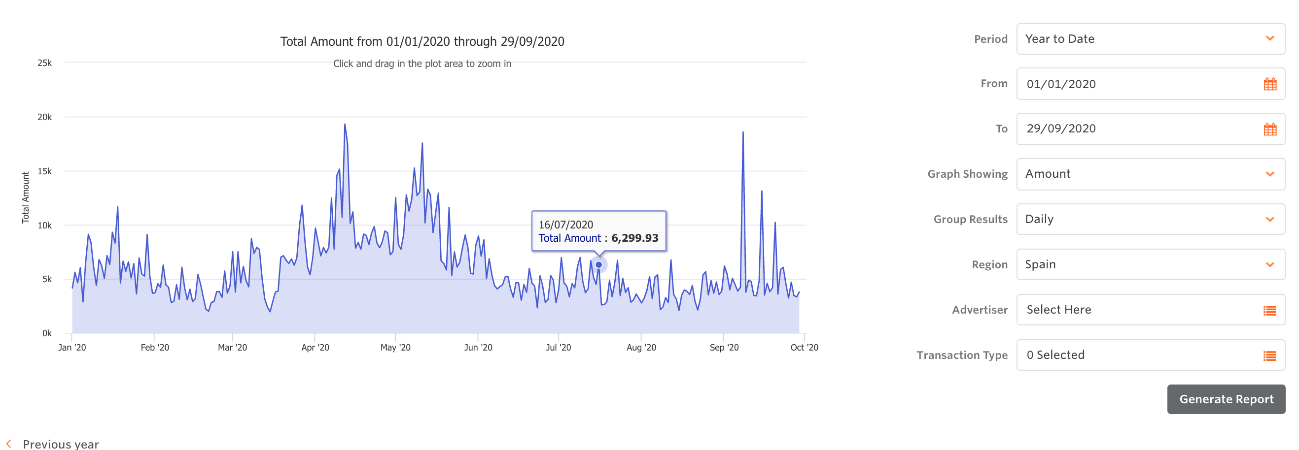 - Once the data refreshes, you will see a line graph reflecting the filters you set, with the Graph Showing field on the Y-axis and the Group Results field on the X-axis. Below, you will see the data grouped by either day, month, or year, depending on which one you selected. At the bottom of the page, are the grand totals of each column broken down by transactions status.