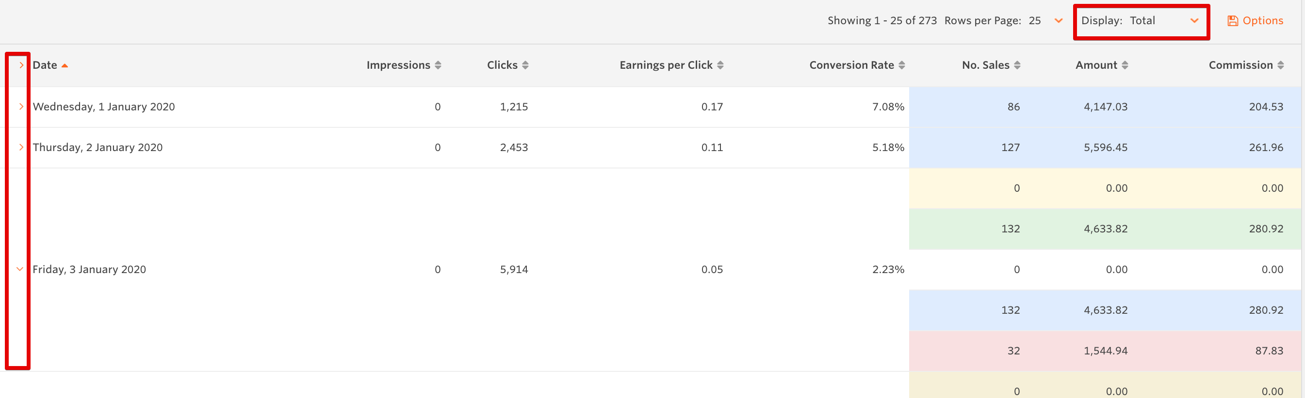 You also have the option to see the transaction status of each date group. To display this, click on Total at the top of the table and select the status you want to view, or click the arrow next to each date and see the full breakdown for that desired date group.