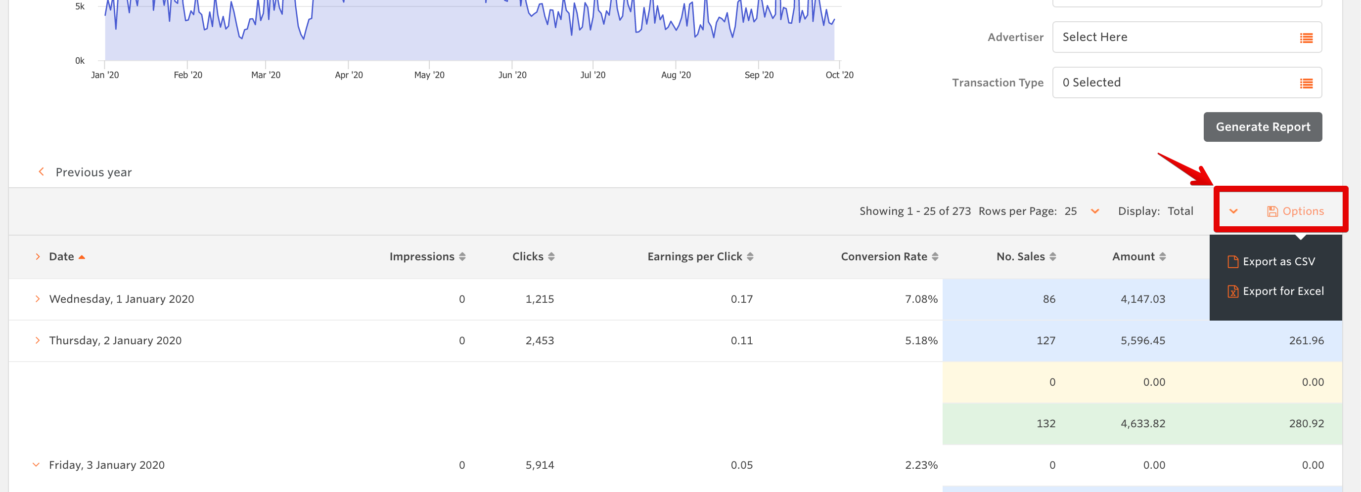 - Select what data you want to see on the line graph by choosing a statistic in the Graph Showing filter. You can choose between Impressions, Clicks, Quantity, Amount, or Commissions