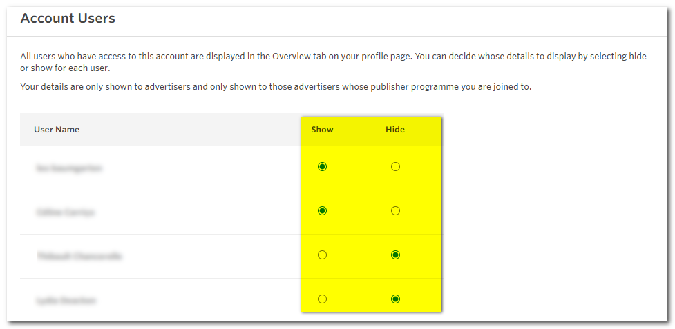 To do this, please navigate to the Account > Manage Users menu, and choose Show or Hide for the contacts you want to display or hide to Advertisers. Then, click on Update User Privacy Settings to save your changes.