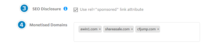 In Divulgazione SEO attivate la casella di controllo Use rel="" sponsored"" per aggiungere automaticamente l'attributo rel="sponsored" a qualsiasi link appartenente ai domini dell'elenco dei domini monetizzati. Per ulteriori informazioni sull'attributo di relazione, consultare la guida di Google.